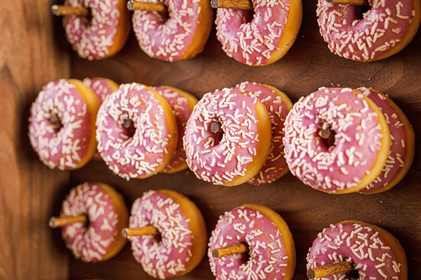 苺チョコとカラースプレーを纏わせたほんのり甘いドーナツ