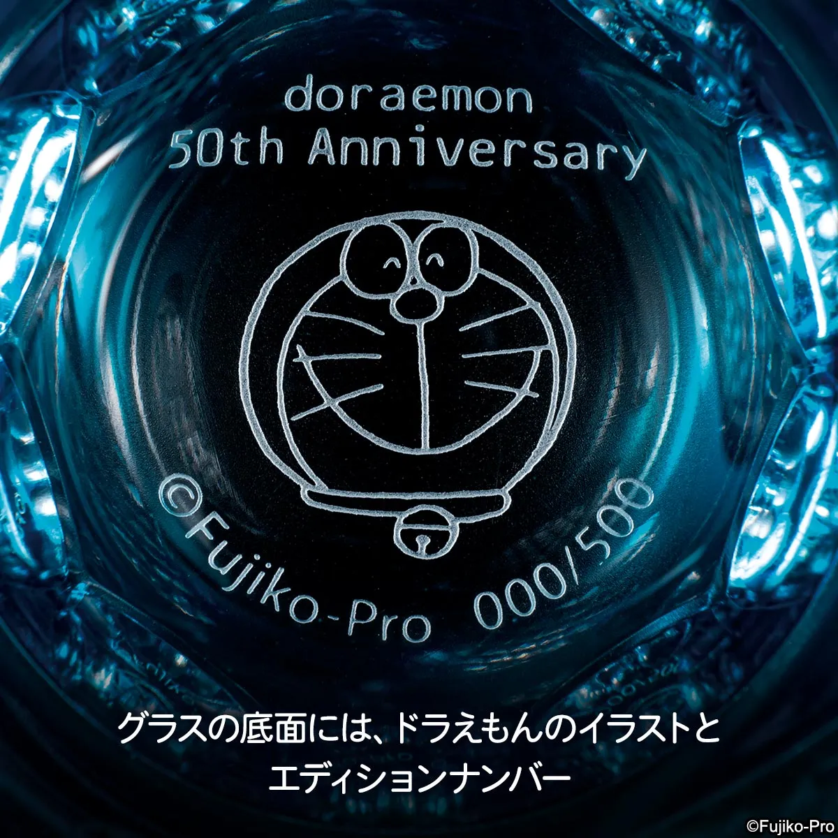 グラスの底面には、エディションナンバーと優しい笑顔のドラえもんが刻まれています。