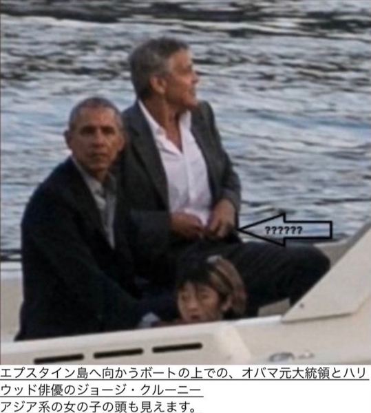 この写真を良く見て下さい。船でエプスタイン島に向かっている写真は、オバマ元大統領に俳優のジョージ・クルーニーがズボンのファスナーに手を当てています。そしてその側には、どうみても未成年の女の子が居ます。これがエプスタイン島の実態です。