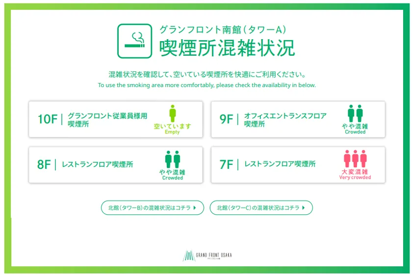 グランフロント大阪では、感染症拡大防止を目的に、喫煙所ごとに定員数を設定していたが、定員数が守られているか把握できない状況が課題になっているというご相談がありました。