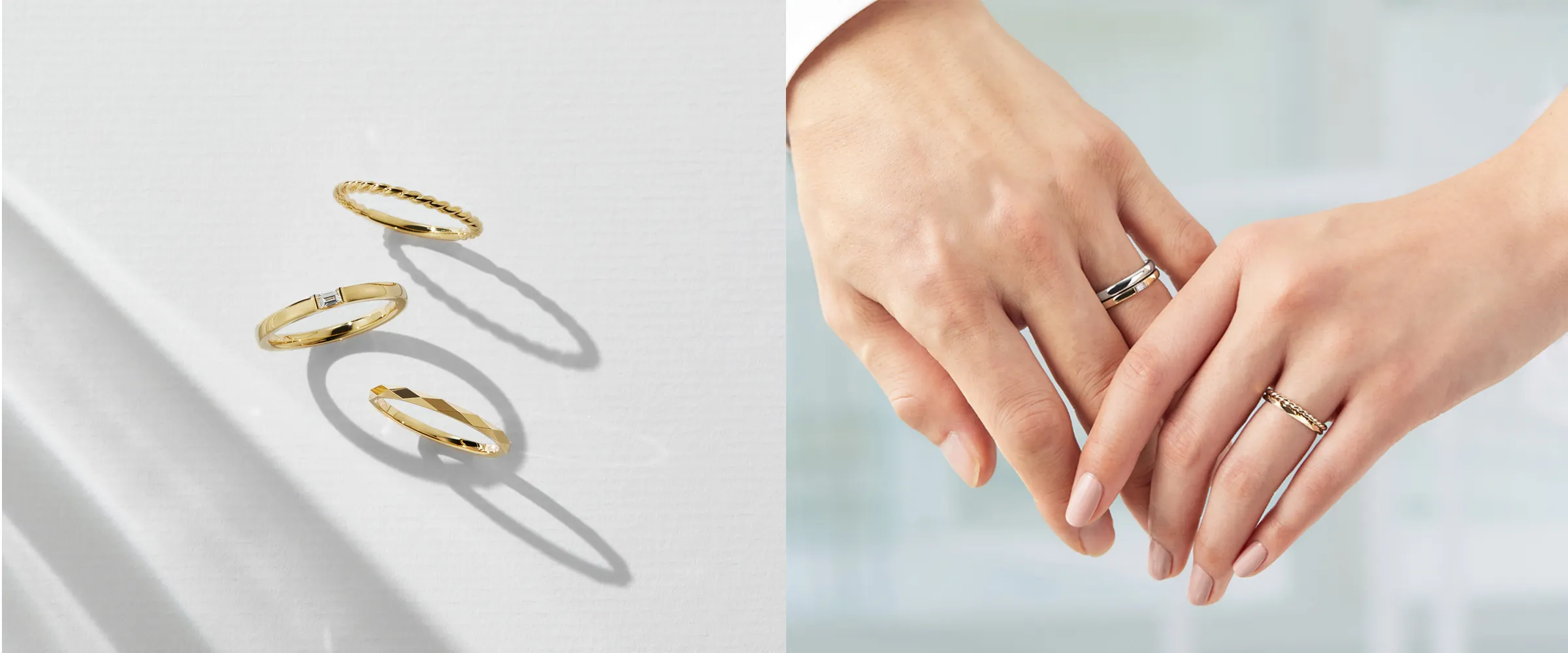 光の重なりが美しく輝き、ブライダルリングとの重ね着けで華やかな手元に