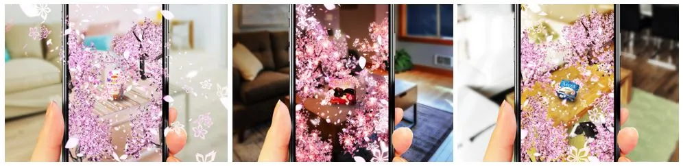 商品に桜の花びらが落ちてくると、画面にフィルターがかかり音楽が流れます。画面の指示に従って平面を写すと、テーブルや床から桜の木が次々現れ、桜がお部屋に舞い散ります。