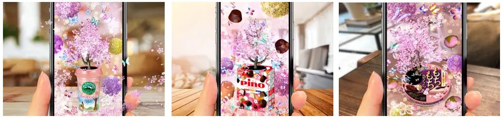 本企画では、大きく分けて2種類のARを体験することができます。全て桜にちなんだものであり、幻想的なものからコミカルなものまで様々な「ネオ花見」が用意されています。また、演出は商品ごとに異なりますので、それぞれの商品の特色を生かしたネオ花見をお楽しみください。なお、ネオ花見のAR体験イメージ動画も公開となります。