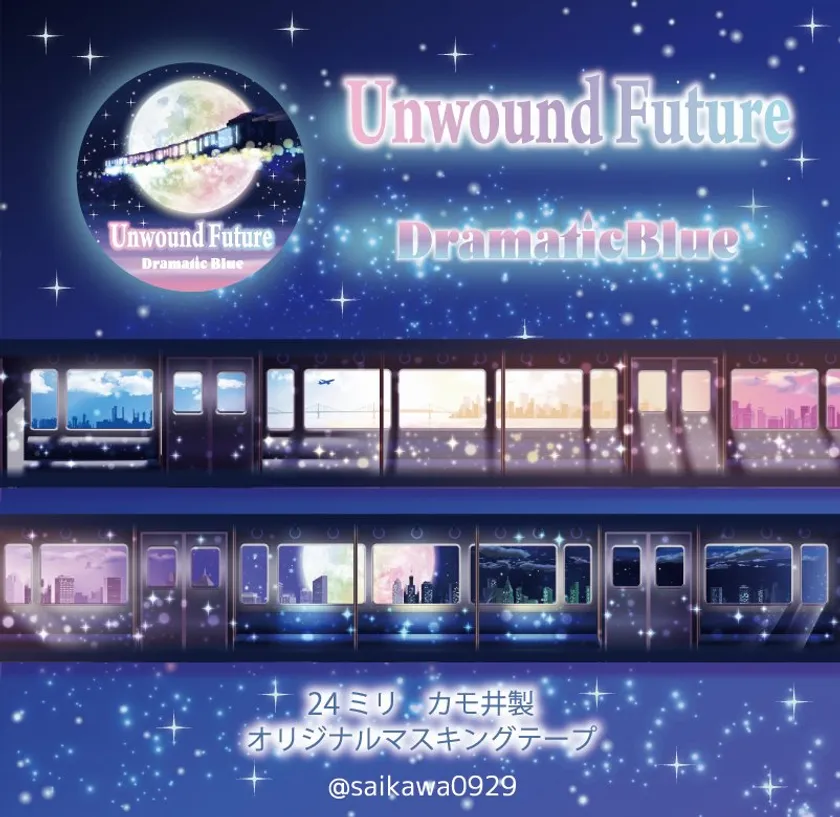 時間旅行のマスキングテープ「Unwound Future」は、ノスタルジックな思い出と、未来への期待、その美しさを表現した24mm作品です。七色のグラデーションや月の入れ方など今までの作品にない魅力を盛り込みつつも、マスキングテープ作家のsaikawaらしさもしっかりと感じられます。