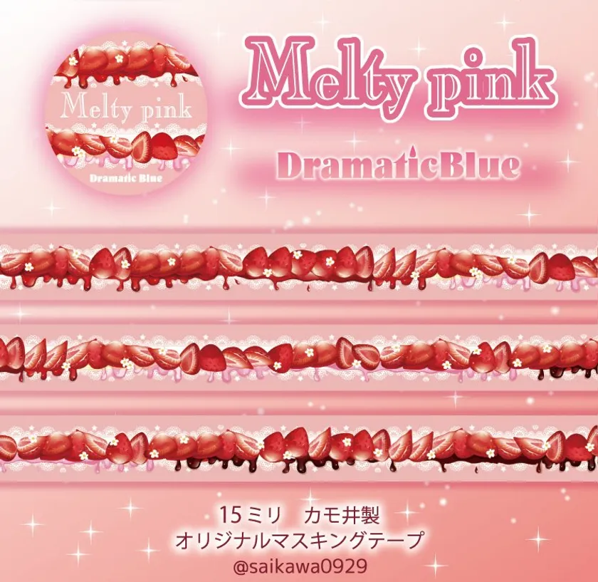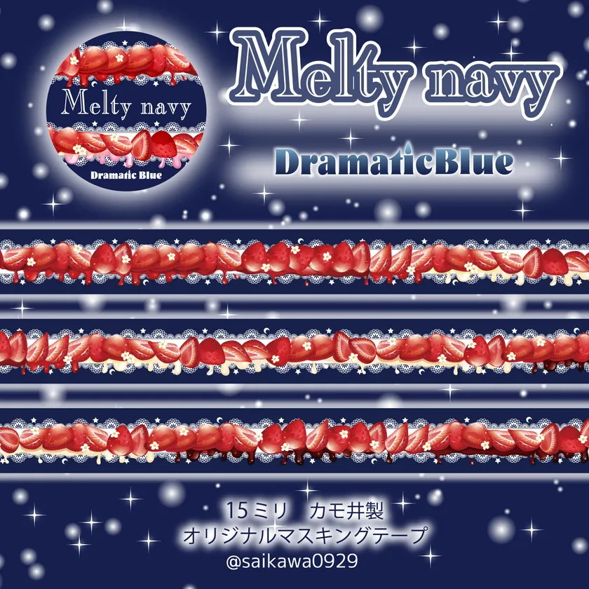 また、両マスキングテープの通販日である3月5日(金)は、とろけるいちご(ネイビー)マスキングテープ「MeltyNavy」の通販日となり、こちらは11月に発売し先月通販をした、とろけるいちご(ピンク)マスキングテープ「MeltyPink」のシリーズで色違いの作品となります。