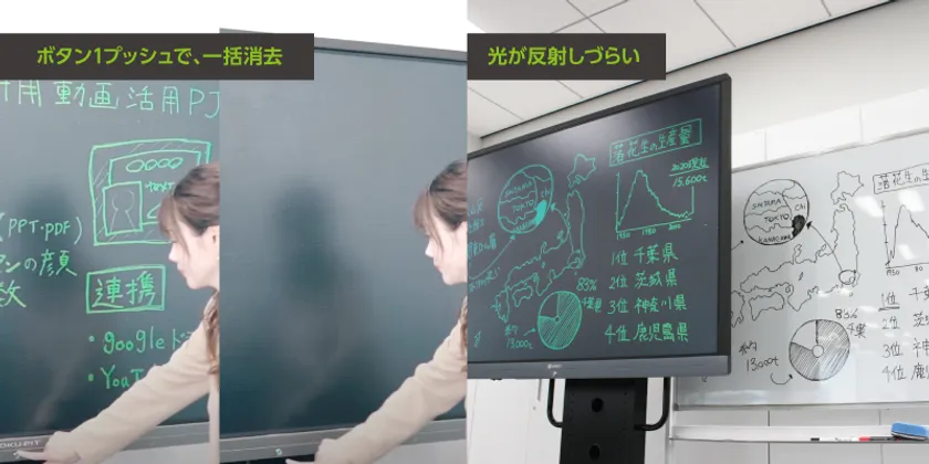 超高輝度・デジタルブラックボードとは、黒板やホワイトボードの書き心地はそのまま、電子化されているため書いたものをボタン1プッシュで消せる、これまでにない新しい電子黒板です。専用ペンや消耗品も不要で導入後のコストの削減にも貢献します。更に、消しカスも出ないため、クリーンで衛生的な環境を維持します。