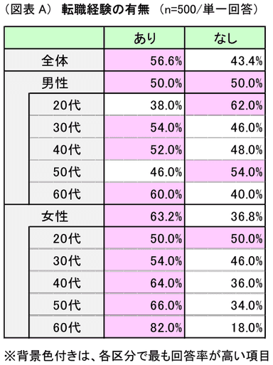 転職経験「あり」の割合において、男女別では「女性」(同63.2%)が「男性」(同50.0%)を上回りました。女性においては全ての年代において「あり」が半数以上を占めており、年代が高まるに連れて「あり」の割合が増加しています。「60代」においては男女ともに定年退職後の再就職が生じやすくなるため年代別で最多の割合となっており、特に女性では8割を超える高い回答率となりました。(図表A)