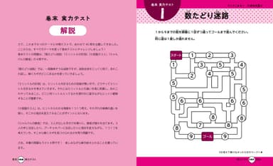 本書は「じっくり見る」、「ちがいを見つける」、「視点を変えてみる」、「解くカギを見つける」、「1つ1つ考える」、「あれこれやってみる」の6章に分かれており、それぞれの能力を伸ばす問題が7問ずつ掲載されています。さらに、中間テスト3問と巻末テスト4問で総合力を試すことができるように構成されています。