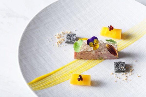 京鴨とヘーゼルナッツのパテ・ド・カンパーニュ 白バルサミコ酢のジュレと黄人参のマリネ