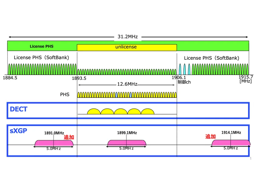 今回の省令改正では、下記Figure 2のように、今まで公衆PHSが利用しておりました周波数帯でも利用が可能なため、構内PHSを利用しながらも、同時に利用が可能となりました。