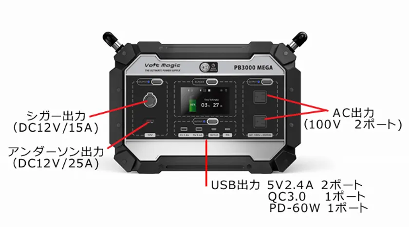 AC100V×2口、DC12Vシガーソケット(15A)×1口、DC12Vアンダーソンソケット(25A)×1口、USB 5V/2.4A×2口、QC3.0×1口、PD-60W×1口