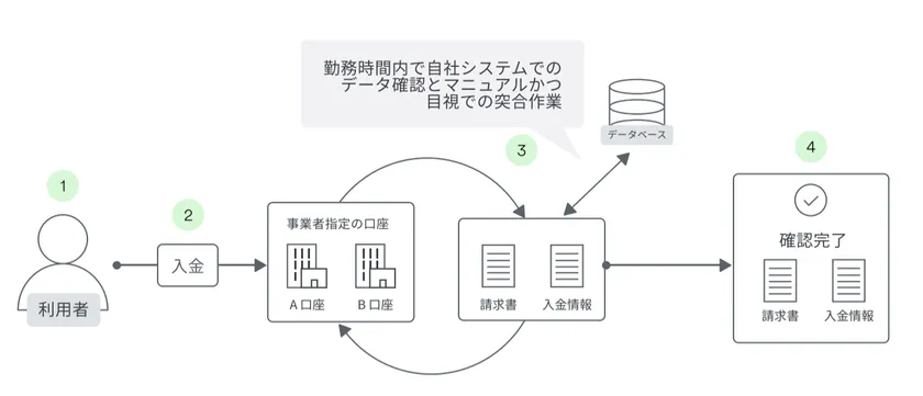 企業の経理部門は、経費精算や入出金確認といった膨大な件数の処理だけでなく、インターネットバンキングサイトや紙の通帳、自社会計システムなど個々の情報を都度確認し処理を進める必要があるため、業務フローが複雑化しています。現状の入金確認作業を例にすると、当該事業者の指定銀行口座に入金があった場合、経理担当者が請求書と入金情報を目検し、該当請求書の消込作業を実施した上で入金確認を完了させることが一般的となっています。このような業務フローでは、確認作業として人が介在するため、業務コストの増大や作業ミスの発生、人的リソースの逼迫などの課題を抱えています。