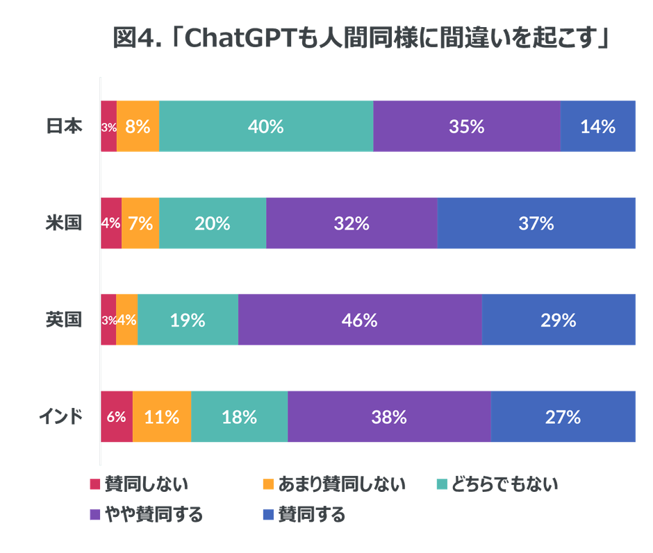米国、英国そしてインドでは30%近くがChatGPTが間違えることに賛同した。一方、日本では「賛同する」がわずか14%にとどまっている。仕事の脅威や影響と同じく、ChatGPTの回答精度に対しての認識も他国と差がある状態だ。