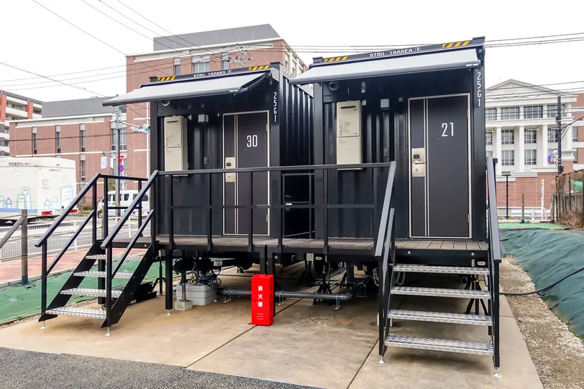 レスキューホテルの平時の姿、コンテナホテル「ザ・ヤード」シリーズは、建築用コンテナモジュールを利用した1棟1客室型の宿泊施設です。1室13m2というコンパクトさながら隣室と壁を接しないため静粛性とプライバシーに優れるほか、上質なベッド、ゆったり使用できるユニットバス、冷凍庫付冷蔵庫、電子レンジ、空気清浄機を全室装備するなど長期の連泊でも快適に過ごせる上質な宿泊空間がお客様の好評を得ています。