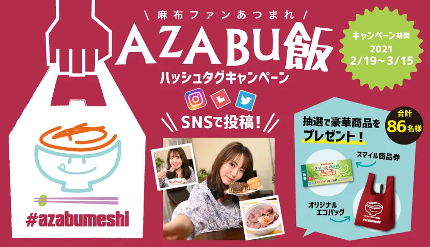 麻布や六本木の対象のお店で注文したフードやドリンクを楽しむ様子を写真に撮り、メッセージを添えて「#azabumeshi」でSNSに投稿するだけ。抽選で商品券やかわいいオリジナルエコバッグが当たるプレゼントも。麻布や六本木でごはんやおやつをデリバリー、テイクアウトするならやらなきゃもったいない!