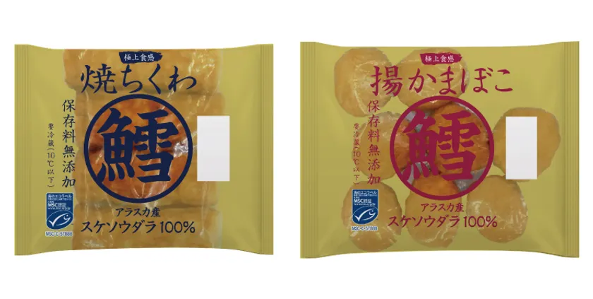 「鱈100% 焼ちくわ MSC」「鱈100% 揚かまぼこ MSC」はMSC認証を取得したアラスカ産のスケソウダラのすり身を100%使用し、魚肉練り製品本来の美味しさを追求した上質な味・食感が特長の新商品です。