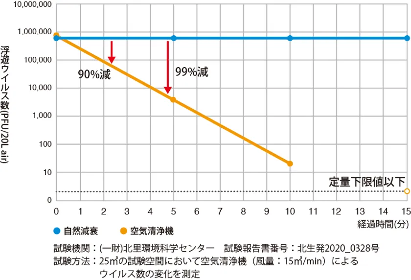 空気清浄機を作動しない場合(自然減衰)では、15分経過しても浮遊ウイルス数がほとんど減少しませんが、空気清浄機を作動させると、3分で自然減衰の90%以下、5分で自然減衰の99%以下に減少しました。