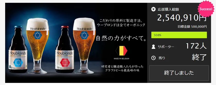 アンインターナショナル合同会社(本社:神奈川県川崎市、代表取締役:MAYA、以下「アンインターナショナル」)は、2020年12月10日(木)より専用グラスで泡の竜巻が楽しめる「ウーブロンドビール」2種のテイストをクラウドファンディングサイトMakuakeで先行発売し、目標の500%である売り上げ250万円という数字を残し、2月10日をもってMakuakeでの先行独占販売を終了しました。