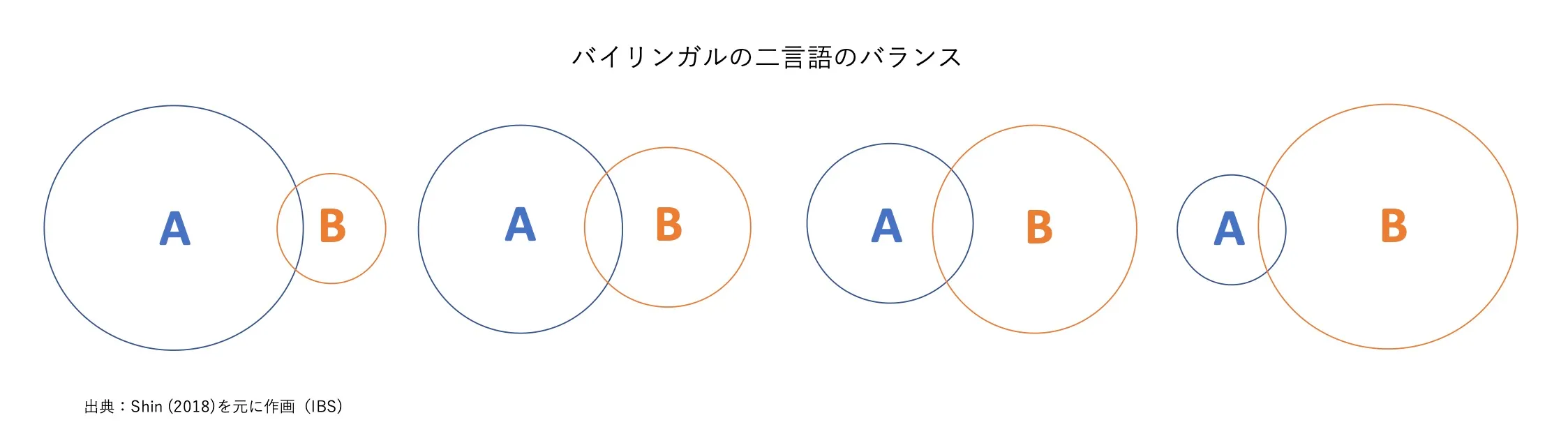 言語Aだけを話すモノリンガル、言語Bだけを話すモノリンガルと比べると、バイリンガルのAまたはBの円はそれぞれ小さいかもしれませんが、それぞれの言語にふれる量がモノリンガルと異なることを考えれば当然のことなのです。この図を作成したShin(2018)は、バイリンガルの言語能力について、バイリンガルの言語Aと言語Bの円を合わせれば、言語Aのモノリンガルや言語Bのモノリンガルの円よりも大きくなる、と説明しています。