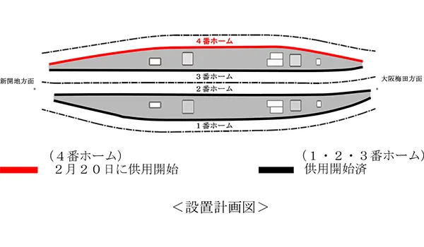 このうち、1・2・3番ホームの可動式ホーム柵につきましては、既に供用を開始しておりますが、このたび4番ホームの可動式ホーム柵の供用開始日が2月20日(土)に決まりましたので、お知らせいたします。