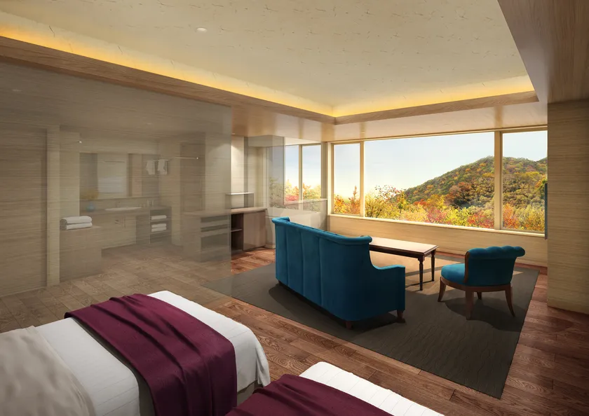 そのうち58室は展望温泉付きで、広がる眺望とともにいつでも新鮮な温泉をご満喫いただけます。全室大きな窓から渓谷が眺められ、最上の眠りを導くベット、独立した洗面台、トイレを完備。静寂性と居住性にこだわります。