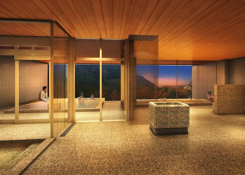 自家源泉が引かれた展望温泉付客室のほか、半世紀を越え先代が発見した泉源と景色を今も変わらず楽しめる大浴場にはパノラマ絵のような渓谷が広がる露天風呂がございます。この自慢の湯は、身体の深い部分まで温めてくれる保温効果が強く“熱の湯”とも呼ばれています。サウナ2種、あかすりルームなど疲れやストレスを癒す設備を完備。日帰り入浴も対応します。男性浴場へ続く通路には遊び心ある20m壁画も是非ご覧ください。