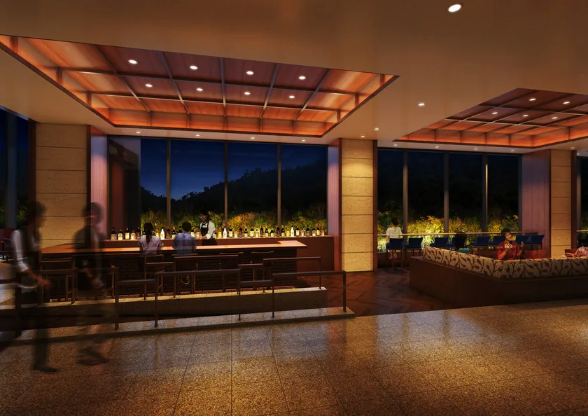 レンガやトラバーチンでしつらえられた落ち着いた雰囲気。渓谷カウンターやボックス席がございます。窓の向こうに眺める夏の緑、秋の紅葉、美しい夜空と色鮮やかなカクテル、静かな音楽とともに大人の時間をお楽しみください。