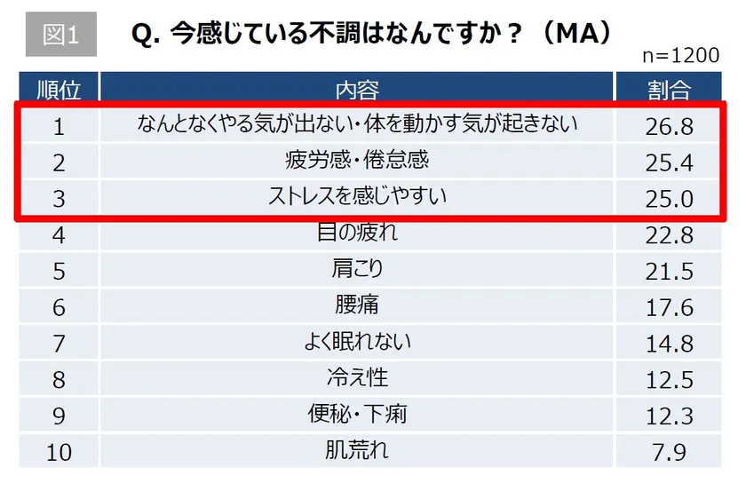 1. コロナ禍の特徴的な不調は「意欲低下」「疲労感・倦怠感」「ストレス」がトップ3に