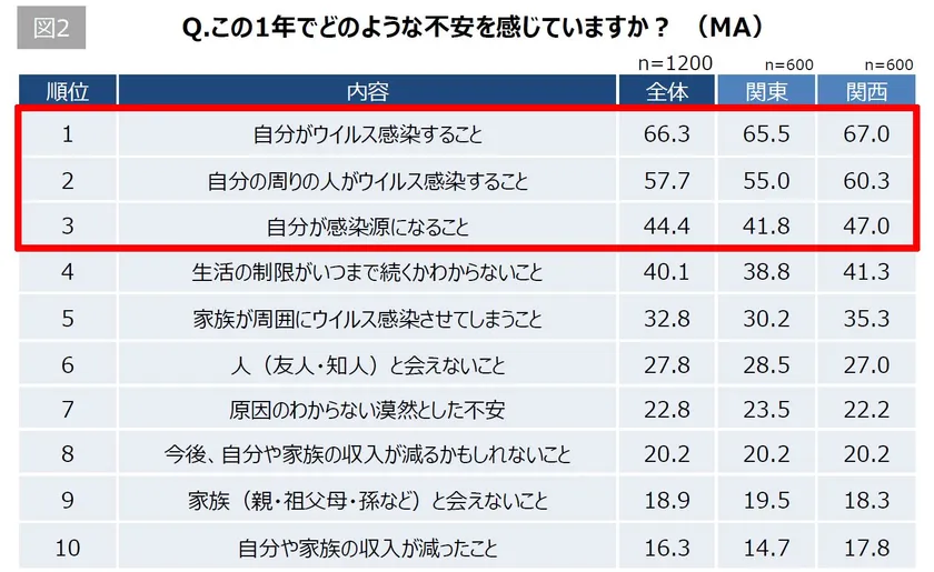 さらに関西では関東と比べて、「ウイルス感染」への不安が高い割合で出ていることもわかりました。病床のひっ迫度や重症者割合は関西のほうが高いとされていることも、不安を感じる一因なのではないかと考えられます。【図2】