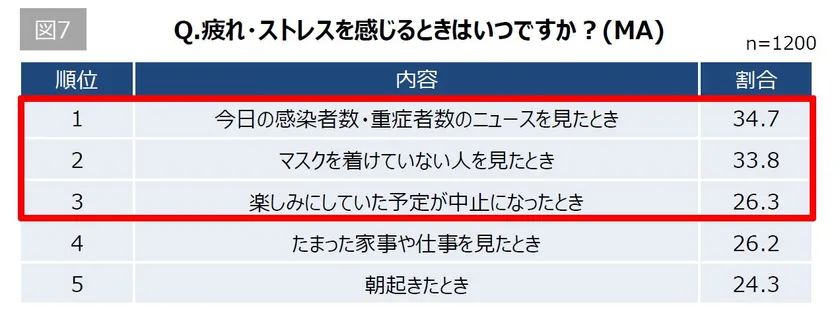 次に、どんなタイミングで疲労を強く感じるかを明らかにするため、「疲れ・ストレスを感じるときはいつですか」と伺ったところ、トップ3は「今日の感染者数・重症者数のニュースを見たとき」「マスクを着けていない人を見たとき」「楽しみにしていた予定が中止になったとき」という結果になりました。コロナ前の生活にはなかったタイミングが上位になり、疲れを感じるときにも今までにない変化が起きているようです。また、感染に対する不安がダイレクトに疲労に繋がっている傾向もこの結果から見て取れます。【図7】