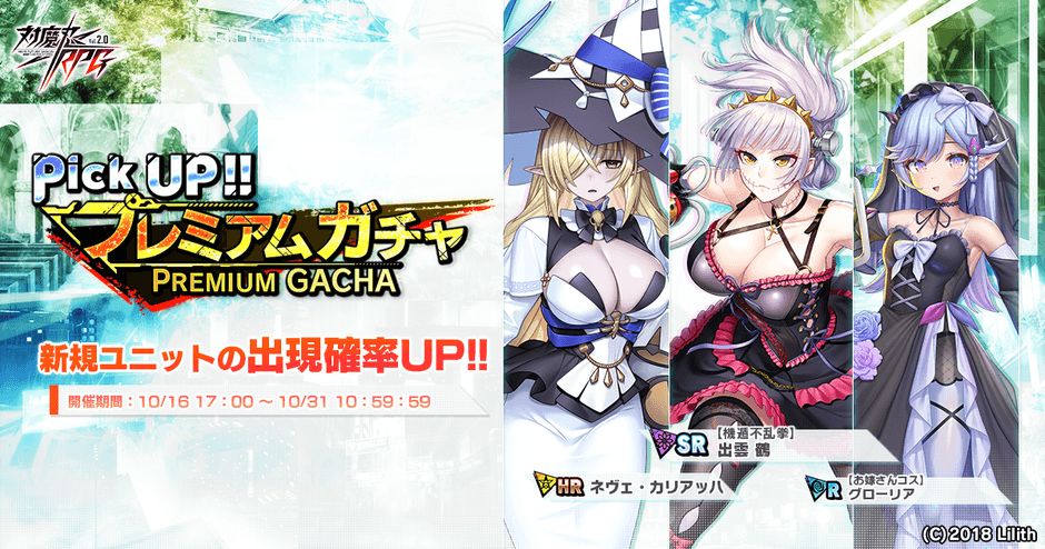 期間中は新規キャラクター『【機遁不乱拳】出雲 鶴』『ネヴェ・カリアッハ』『【お嫁さんコス】グローリア』の出現確率がアップしております。
