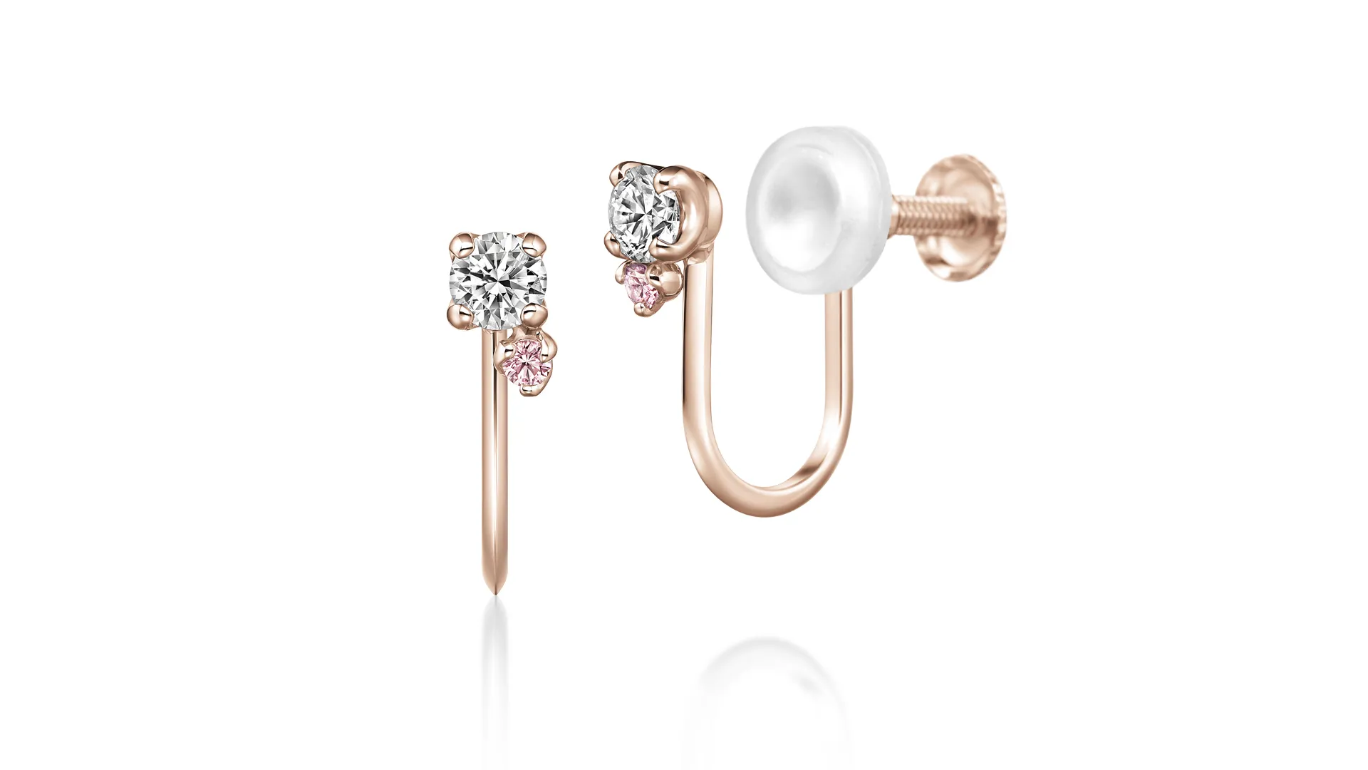 ピンクサファイヤをあしらったイヤリングは、エンゲージリングとお揃いのスイートなデザイン。