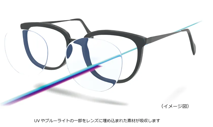 〇透明度が高くレンズ表面反射が少ない、目元がクリアに映る新しいブルーライトカットレンズ