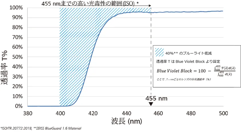 有害性が言われている400~455nmのブルーライトの透過を最大約40%低減*9。さらに400nmまでの紫外線はフルプロテクション。