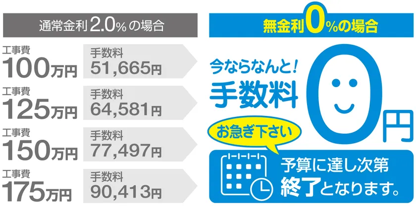 外壁・屋根塗装のリフォーム・リノベーションを専門に、全国19拠点で事業を展開する当社では、「塗装で日本に活力を!」をスローガンに、外壁や屋根のリフォームを無金利で実施することで、少しでも皆さまのお役に立ちたいと考えました。例えば、工事費100万円のローン手数料は、通常金利2.0%の場合、60回払いで5万1,665円、175万円かかる工事では、9万413円の手数料がかかりますが、今ならこの金利費用負担は「0円」。また、61回以上の支払いの場合でも当社のリフォームローンは、業界最優遇の低金利2.0%(実質年率)です。(※予算到達次第キャンペーンは終了となります。)