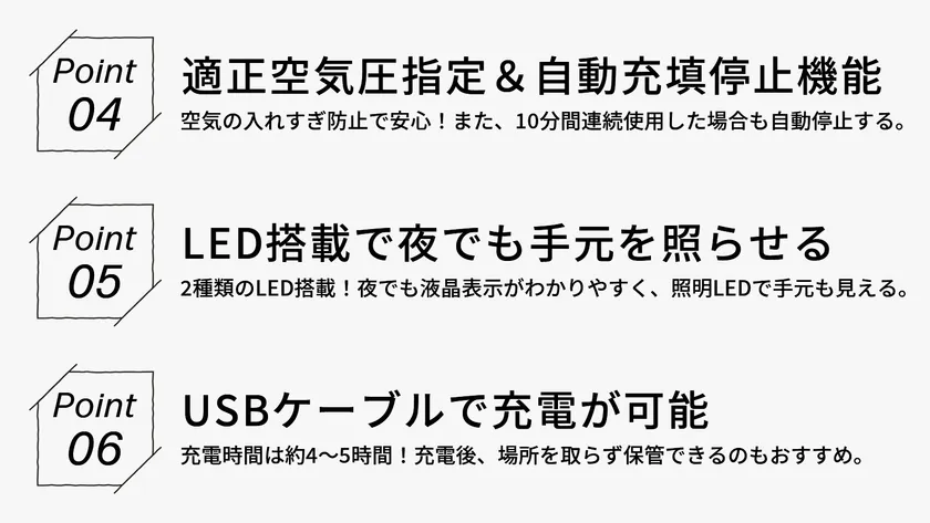 タイヤに記載されている目安の空気圧を設定し、設定した値に達した時点で自動停止します。空気の入れすぎや、空気が足りないなどの不安を解消してくれます。