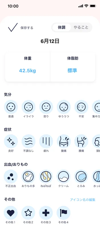 ・「その他」のアイコンは、好きなアイコン名に編集でき、自分に合った項目の記録をすることができます。
