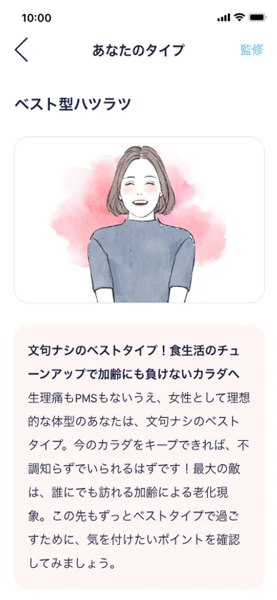 ・自分の生理記録に基づいた生理のタイプ別フィードバックが、しっかりとした内容で感動した。(39歳・女性)