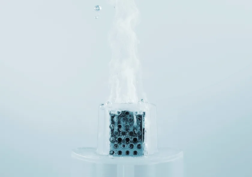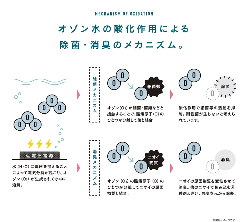 「High-Per OG」は素子に低電圧を通電することで水(H2O)を電気分解し、オゾン(O3)を発生させます。オゾンは高酸化作用を有しており、菌や臭いの原因物質を酸化させることで、それらを元から除去。発生したオゾンは反応ののちには酸素に戻るので、安全性にも優れています。また、水道水と低電力を使用するため、ランニングコストをおさえると同時に、繰り返しつかえるのでゴミを増やさない環境配慮にも適しています。