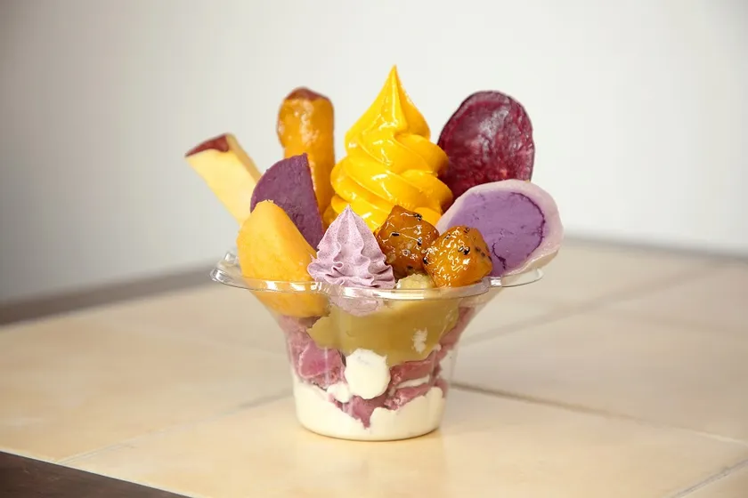 濃厚でほっこりとした味わいのさつまいもソフトクリームに甘縁棒やスイートポテト、紫芋大福などをトッピングした芋好きにはたまらないパフェ。