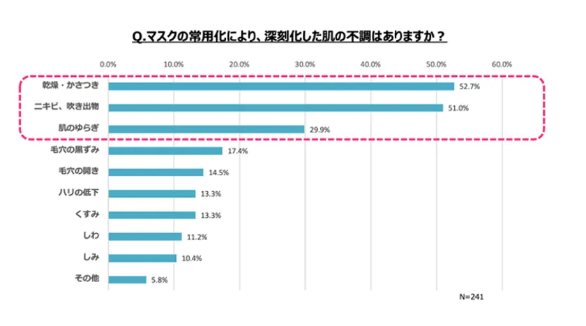 ◇マスクの常時着用で6割以上が「肌悩みが深刻化」と回答。肌悩みのトップは「乾燥」