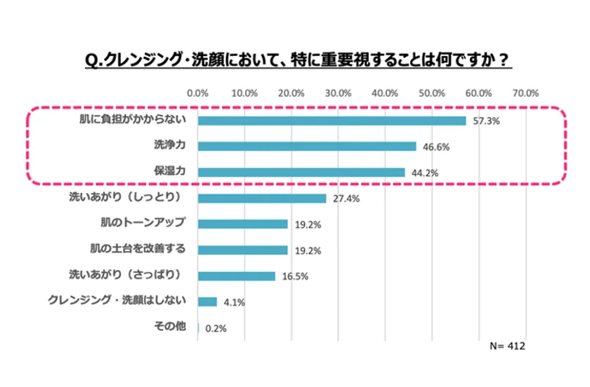 クレンジング・洗顔において重要視することの1位は「肌に負担がかからないこと」(57.3%)、2位「洗浄力」(46.6%)、3位「保湿力」(44.2%)という順番となりました。肌トラブルが深刻化する中、クレンジング・洗顔においても、洗浄力だけでなく、肌にやさしく保湿力のあるものを選ぶ傾向が伺えます。