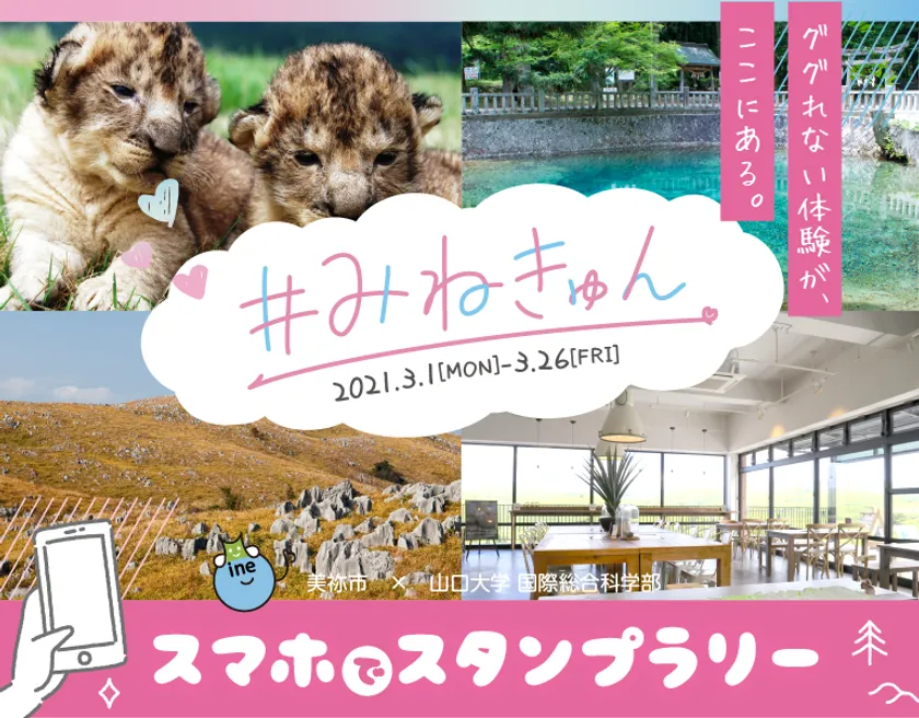 Mine観光地域づくり応援隊に入隊している山口大学国際総合科学部の学生が、秋吉台地域のコロナ禍における誘客や滞在時間の延長による消費拡大を目的に、美祢市内の「きゅん」と感動したスポットを集めてデジタルスタンプラリーを考えました。スタンプラリーは、2021年3月1日(月)より開始いたします。