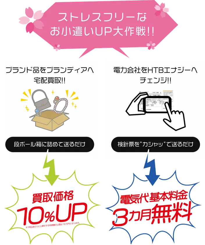 電気小売り事業として「HISでんき」を販売するHTBエナジー株式会社(本社:福岡県福岡市、代表取締役社長:赤尾 昇平)は、ブランド品の宅配買取サービス「ブランディア」を運営する株式会社デファクトスタンダード(本社:東京都大田区、代表取締役社長:仙頭 健一)と提携し、新生活をスタートするにあたり、電気の契約の見直しをされる方、クローゼットの整理をされる方に向けた「春の新生活応援キャンペーン」を2021年3月1日(月)~4月30日(金)まで開催します。