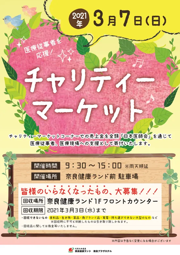 日々、医療現場を昼夜を問わず支えておられる医療従事者の方々への支援を目的としたチャリティーマーケットを、奈良健康ランド フリーマーケット会場内にて実施致します。