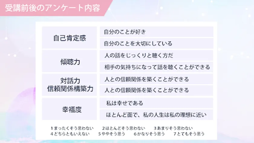 今回の研究では、受講生に対して事前事後アンケートを実施します。幸福度の計測と付随して自己肯定感、対話力、傾聴力、信頼関係構築力がどのように講座を通じて変化したのか調査します。