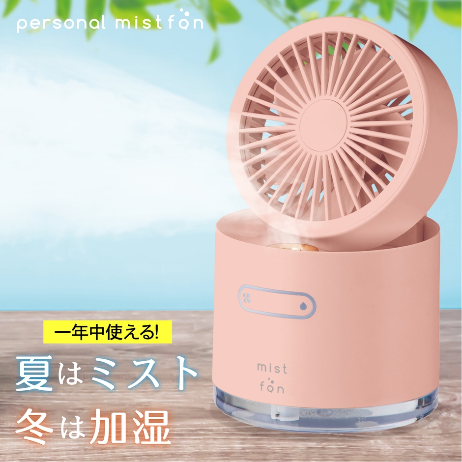 「パーソナルミストファン」夏は扇風機としてミスト状の風が涼しく、冬は乾燥対策の加湿器として使用できる年中使える商品となっております。
