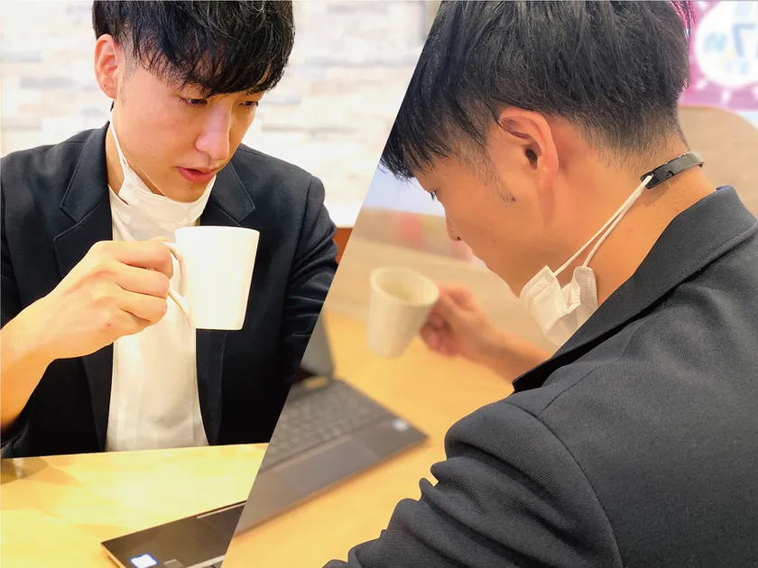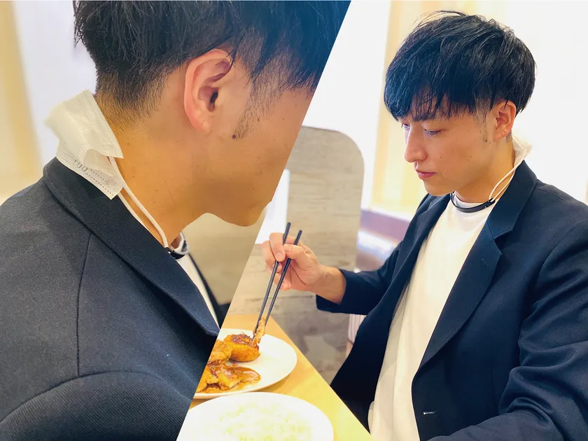 反転させることで食事中もマスクが邪魔にならず首にかけておけます。