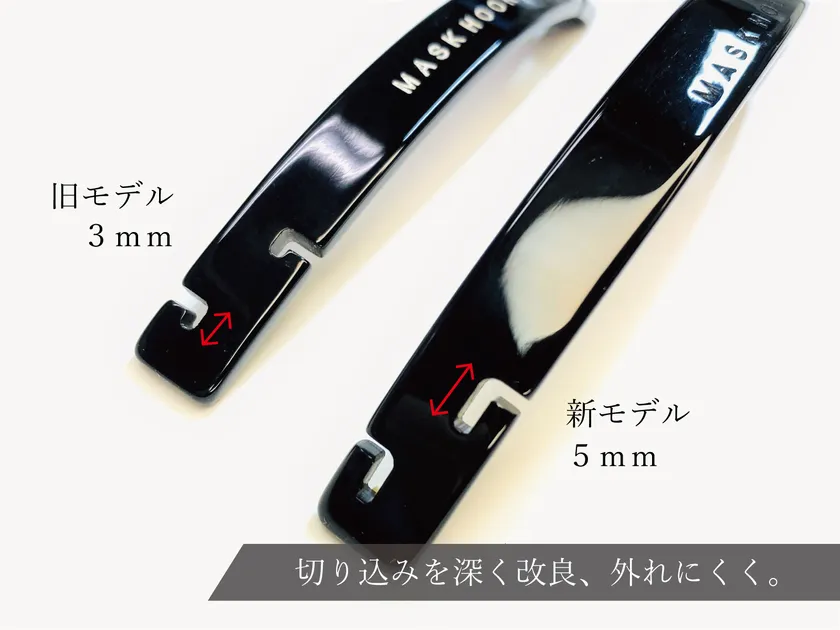 強度はそのままにマスクゴムをよりしっかりとキャッチする形状に改良しました。