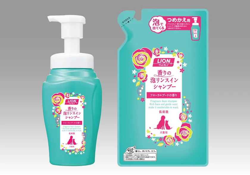 そこでこの度、好調の泡タイプで、華やかなフローラルブーケの香りがやさしく続く『ペットキレイ 香りの泡リンスインシャンプー 犬猫用』を新発売いたします。